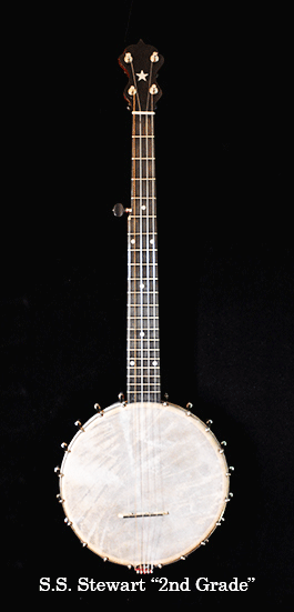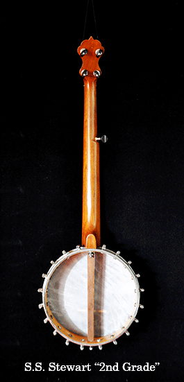 An 1890's Stewart. The cherry neck has a 24" scale and 1 5/16" nut width. It has been fitted with modern, geared tuners with ebony buttons. The 10 1/8" pot is a metal clad, thin maple rim and calf skin head. Bright early Stewart sound.