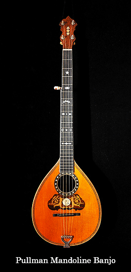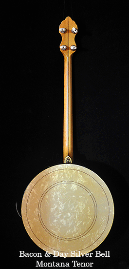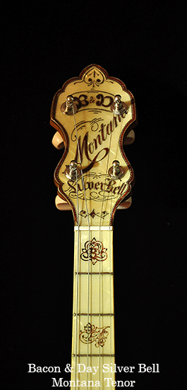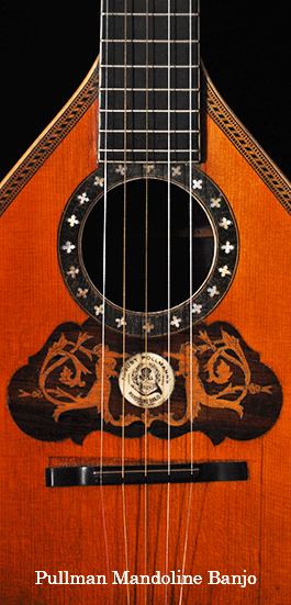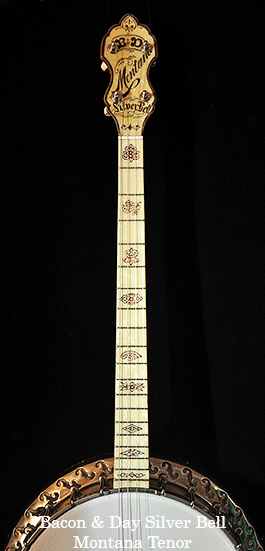 1920's banjo with an amazing sound. A 23" scale neck, and 1 1/4" nut width with an engraved pearliod fingerboard and peghead. The pot is 11", all original with a working knee mute. In excellent + condition. The pinnacle of tenor banjos.