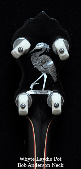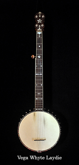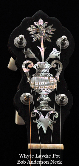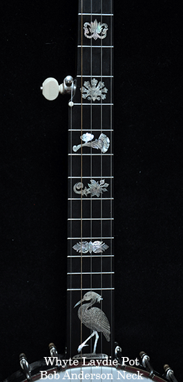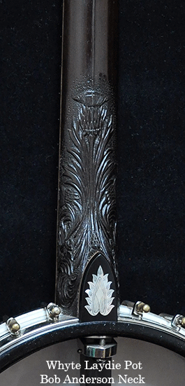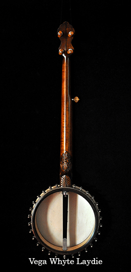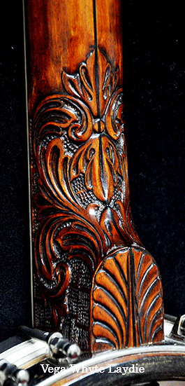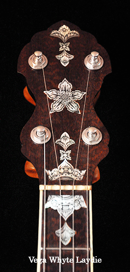 A custom Doug Unger 26" scale neck with fancy inlays and and exquisite engraving. Snakewood fingerboard and peghead overlay. Maple neck with a georgous carved boatheel. An 1 3/8" nut width. The 10 1/8" Vega Whyte Laydie pot #33302 has a nice pig skin head. A great clawhammer banjo. Doug Unger at his best!