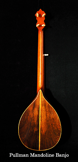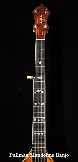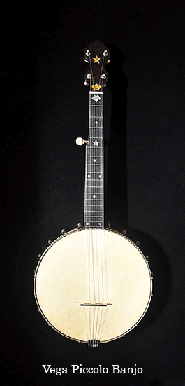 A marriage of an orginal 5 string Vega Piccolo Whyte Laydie neck to a Beltone 11" pot. The neck has a 1 1/4" nut width and a 19 3/4" scale, geared tuners on the peghead, with a friction 5th peg. The pot is a 1/2" thick bird's eye maple rim width with a rolled brass tone ring and a calf skin head. It has a great warm tone, is cute, and fun to play!