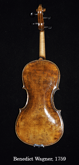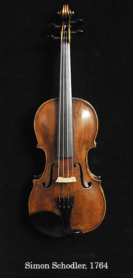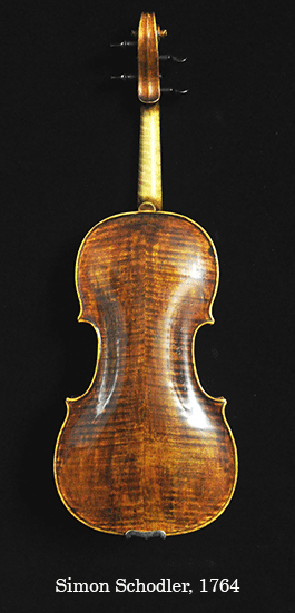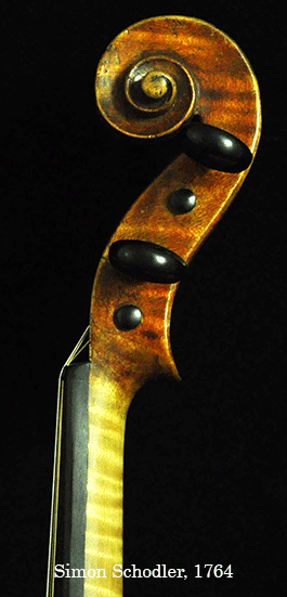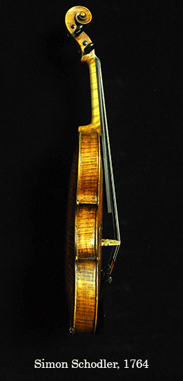 Simon Schodler, 1764. A Bavarian maker, Schodler made violins with eloquent simplicity, reminiscent of the Joseph Hornsteiner style. Delicate, but sharply pointed corners with thrown-out edging.