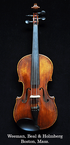 Orrin Weemann imigrated from Germany in 1872 to establish one of the oldest violin houses in Boston MA. First in business with his sons, he then joined a partnership in 1910 with Beal & Holmberg (both musicians). Although they carried instruments for sale for all levels of playing; their own instruments were all custom made to order. The violins were mostly made by Weeman until his retirement in 1919. The instruments we made with a maple back and spruce top, with the quality of spruce and proper amounts of graduation hand tested.
