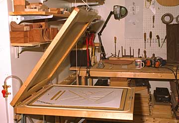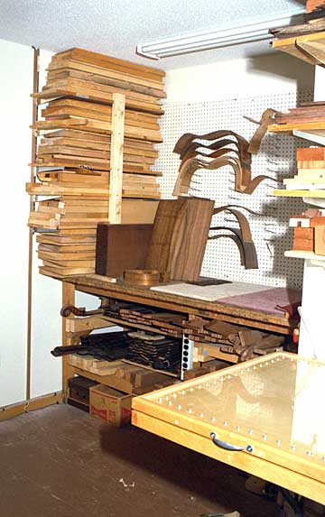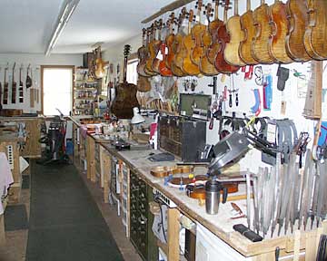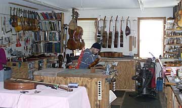 The second story houses the repair/restoration workshop, a very well-equiped central machine room and rough-out area, and a new instrument assembly and humidity controled room for glue up and humidity-sensitive repairs as well as wood stacks. Our repair department does all manner of fretted and orchestral instrument repair and restoration. We are a very unusual shop in that we work on both fretted and orchestral instruments. In the old European tradition many luthiers’ shops produced all kinds of stringed instruments, including lutes and guitars, so it was not unusual for a luthier to have such a broad range of interests. This being Maine, a very rural state with a small population, a broad range was necessary for survival as well. Our location here in Rockport has been intrinsicly connected to the Bay Chamber Concerts and the many world-class performers they have brought to our area. Those players, such as Marc Johnson, have come to trust and rely on our restoration services as well as fretted players across New England, such as Don McLean, Gordon Bok, and other notable players such as Fareed Haque. We have all of the major tools found in a modern woodworking shop (including a dupe carver and thickness sander), and although we do a large amount of work by hand, we also recognize that in today’s world machine-assisted work can save a great deal of time.